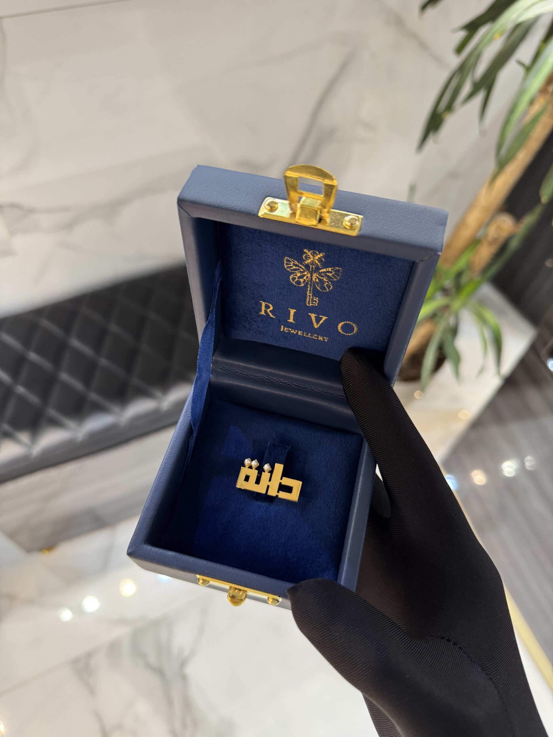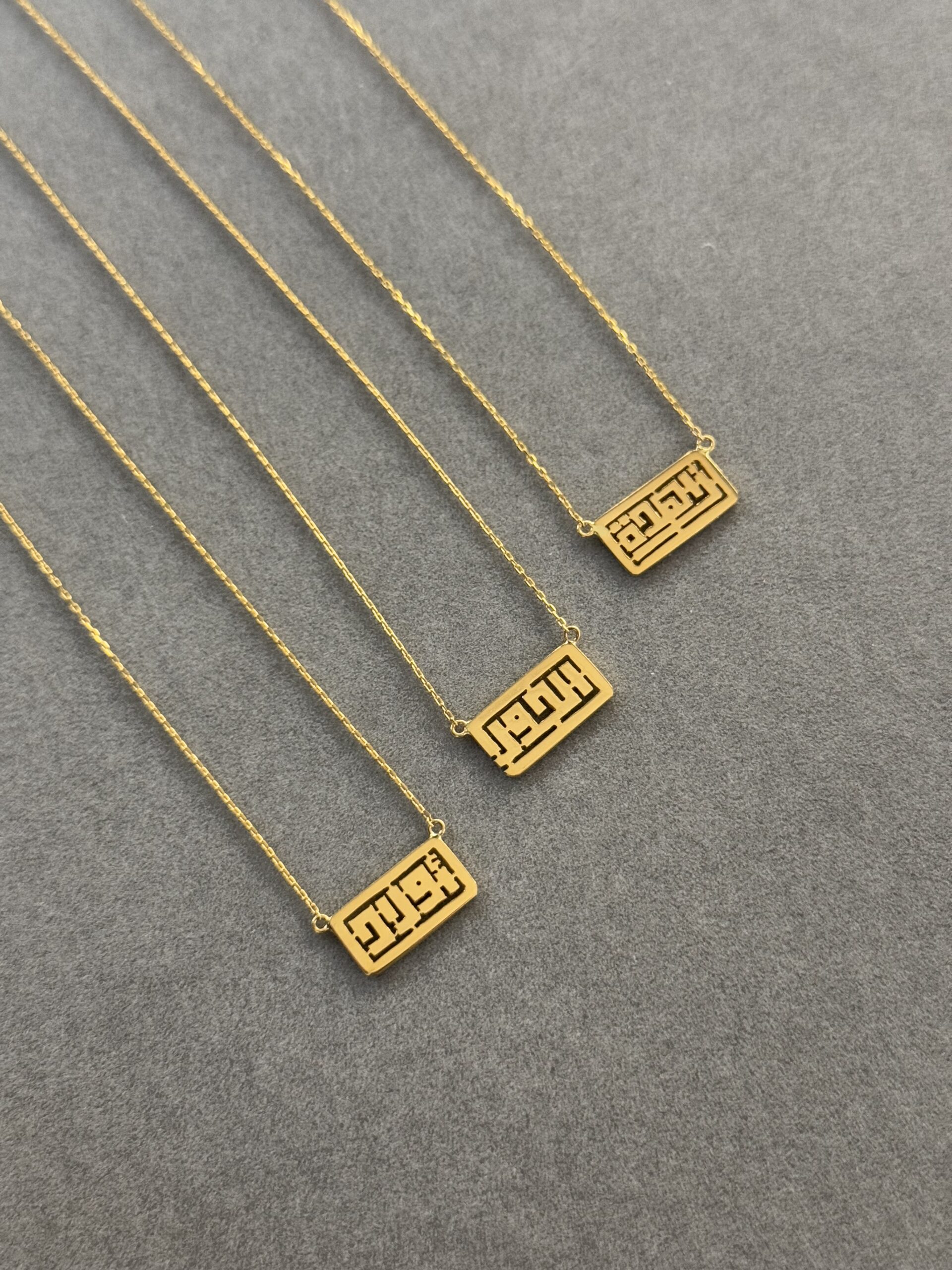قلادة أنيقة تحمل اسمين يتوسطهما قلب، تصميم يرمز للحب والارتباط الأبدي. قطعة فريدة تروي قصتكم في لمسة راقية “.