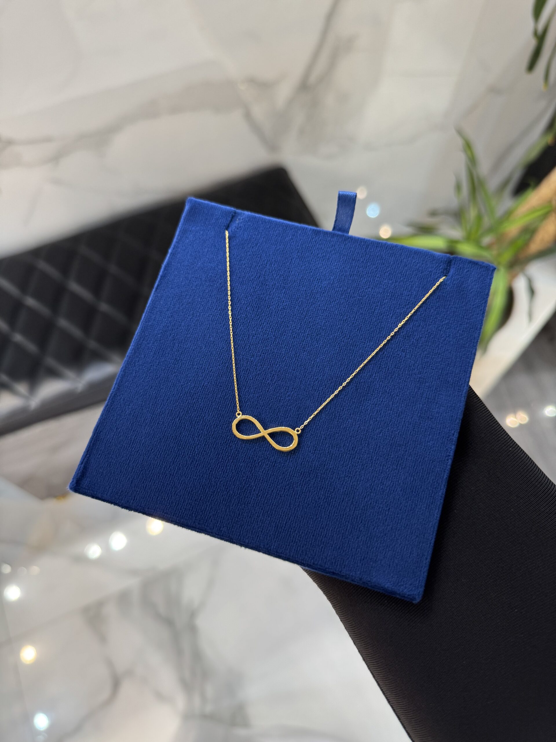 “قلادة مالانهاية… رمز الحب الأبدي والتواصل الذي لا ينقطع، بتصميم أنيق يخلّد المعنى في قطعة ذهب تُروى على عنقك.”